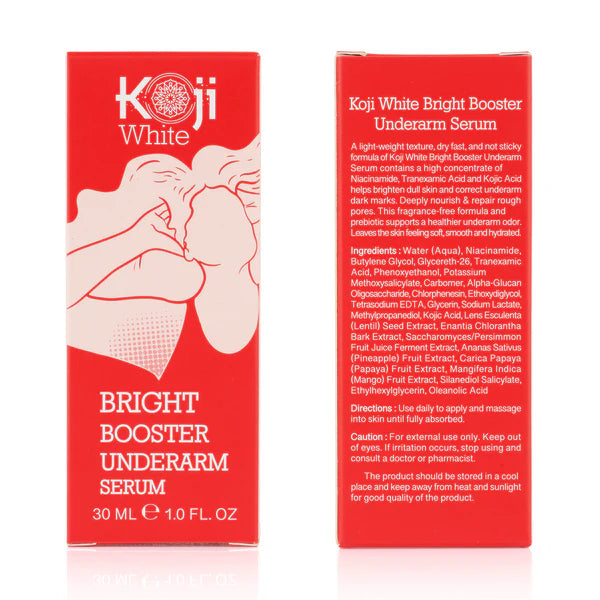 A light-weight texture, dry fast, and not sticky formula of Koji White Bright Booster Underarm Serum contains a high concentrate of Niacinamide, Tranexamic Acid and Kojic Acid helps brighten dull skin and correct underarm dark marks.